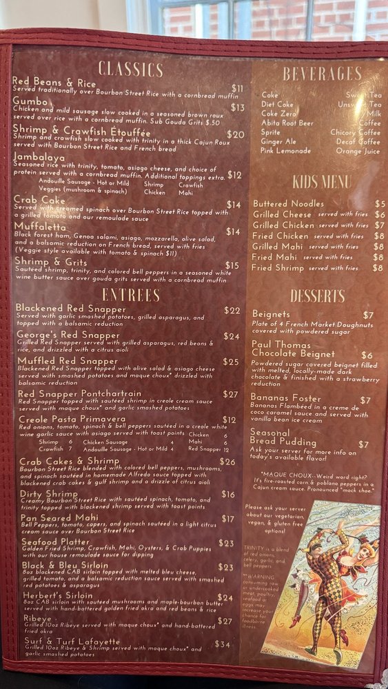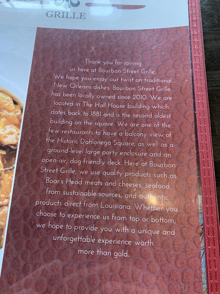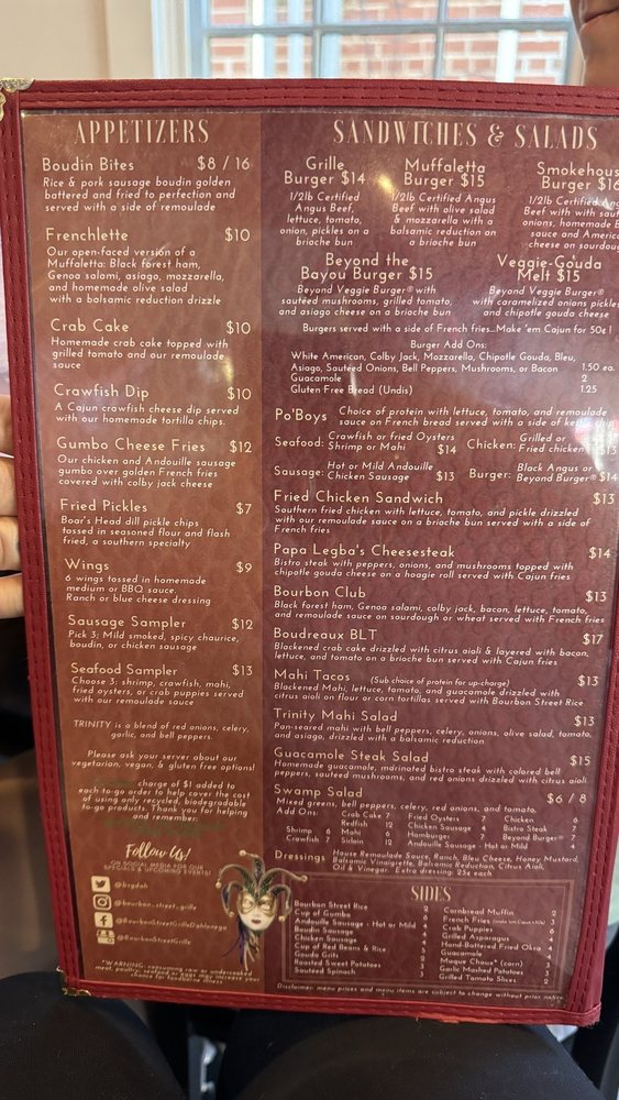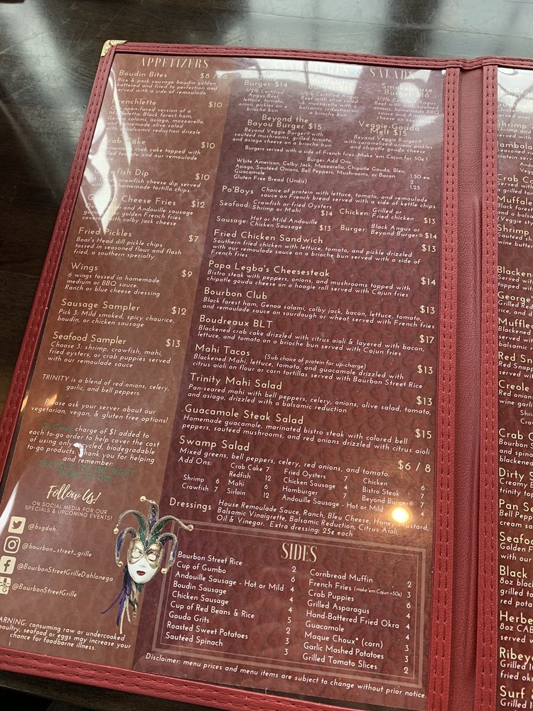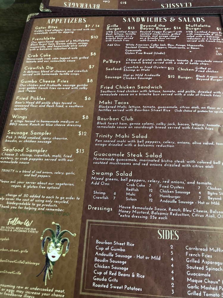 Introducing the menu at Bourbon Street Grille, a Cajun/Creole, Burger, and Seafood restaurant in Dahlonega, GA, offering a variety of options for everyone. From Gator Bites and Frenchlette appetizers to Trinity Tilapia Salad and Fish Tacos, there is something for every palate. Main courses like Blackened Redfish and Crab Cakes and Shrimp are served with delicious sides like garlic mashed potatoes and bourbon street rice. The reviews rave about the food quality and the vibrant atmosphere that transports diners to New Orleans. Customers appreciate the friendly service and diverse menu choices. Overall, Bourbon Street Grille provides a unique dining experience with exceptional dishes that leave a lasting impression.